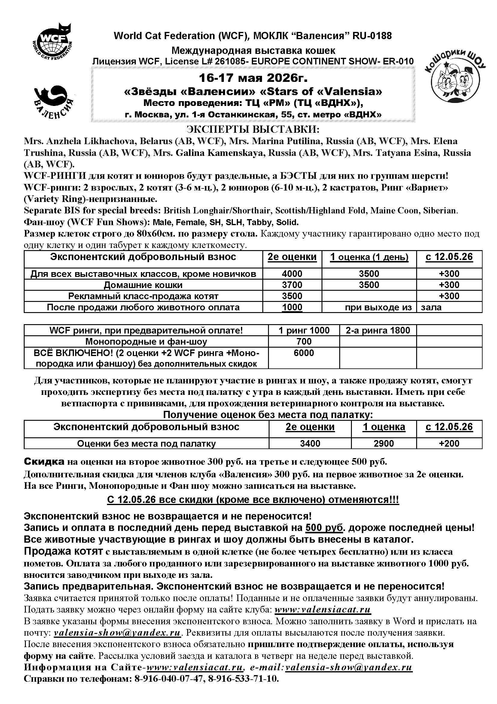 C выставляемым животным в одной клетке (до 4-х котят к выставляемому), класс пометов и рекламный класс. Оплата за любого проданного или зарезервированного на выставке животного 1000 руб. Вносится заводчиком при выходе нового владельца из зала. Пожалуйста, подойдите к столу администрации, внесите взнос, не допускайте конфликтов.